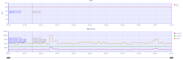 在10分钟游戏期间,一加平板Pro可稳定在120 FPS,帧数曲线稳如一条直线,最终给出了119.99 FPS的成绩,也可以视为满帧。