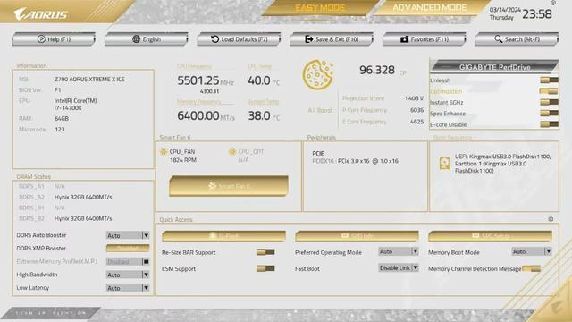 BIOS界面同样是专属的定制版界面,支持i9-14900KS一键6.3GHz和DDR58266MHz内存,巅峰性能唾手可得。还支持AIBOOST功能,可以借助AI大数据自动评测CPU超频潜力,以SP“饼干分”形式显示,方便玩家精细化超频操作,同时无需重启即可无需重启或进入BIOS即可完成一键超频。