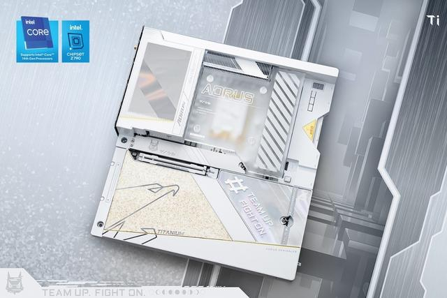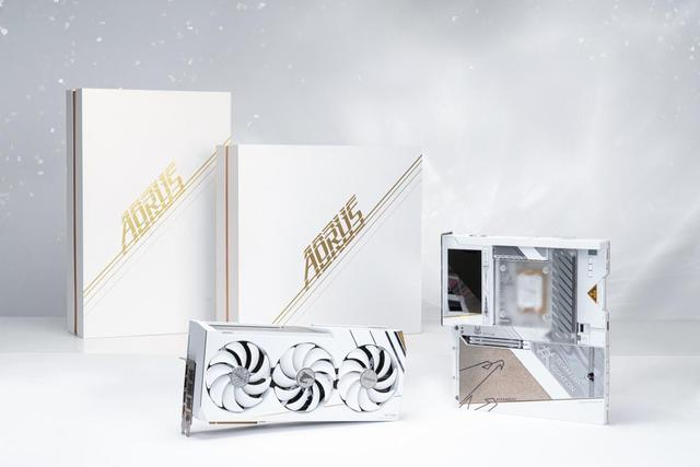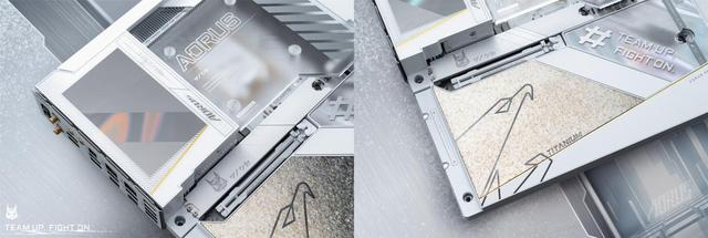 其中钛金雕主板型号为Z790AORUS XTREME ICE(简称:Z790钛金雕主板),显卡为AORUSRTX 4080 SUPER XTREME ICE 16GB(简称:RTX4080SUPER钛金雕显卡)。两者整体的设计都以纯白色为基础,辅以黄金色作为点缀,加入钛金属纹理装饰面和半透明绚丽反光镜面处理,在不同视角可以呈现多种不同的视觉效果。这种钛冰花的设计在机箱的的灯光搭配下更好看!