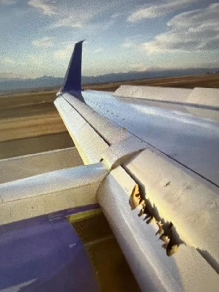 这张拍摄于2月20日的视频截图显示,美国联合航空公司一架19日执飞旧金山至波士顿航班的波音757-200型客机机翼受损。新华社发