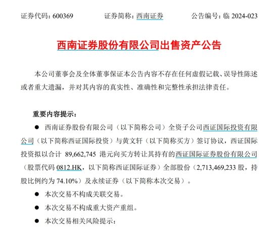 6月21日,西南证券公告称,全资子公司西证国际投资已与买方黄文轩签订协议——西证国际投资拟将其所持有的西证国际证券全部27.13亿股股份(持股比例约为74.1%)和本金总额为5.8亿港元的永续证券进行转让。
