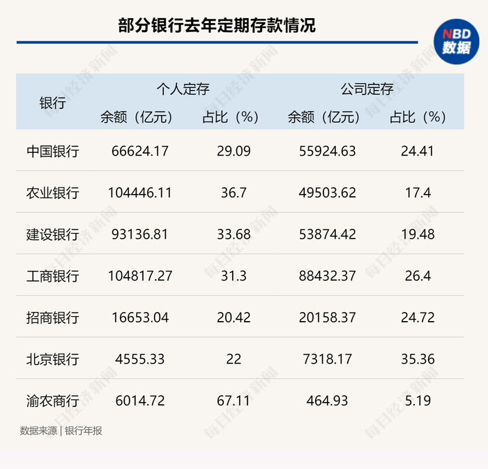 例如,年报显示,中国银行去年末个人定期存款余额为6.66万亿元(集团口径),较上年末增加1.28万亿元,在存款结构中占比从26.65%增至29.09%;公司定期存款占比提升了2.32个百分点至24.41%。