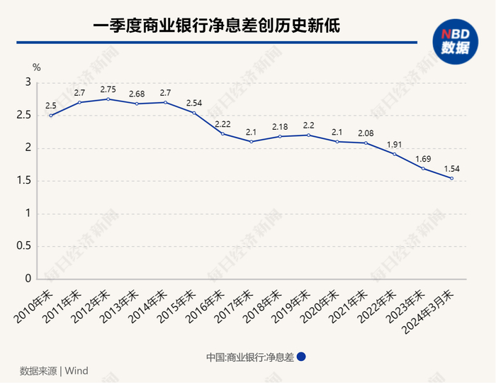 国家金融监督管理总局发布的2024年一季度商业银行主要监管指标显示,银行净息差延续收窄趋势。今年一季度,商业银行净息差为1.54%,较去年四季度的1.69%下滑了15个基点,创下历史新低。