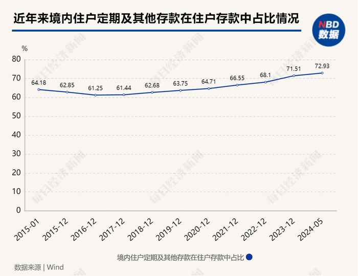 《每日经济新闻》记者梳理央行披露的数据发现,截至今年5月,境内住户定期及其他存款在住户存款中占比达到72.93%,较上年同期提升了1.49个百分点,而这一数据在2015年1月仅为64.18%。同期,“定活比”(定期存款/活期存款)由1.79上升至2.69,定期存款和活期存款几乎“七三开”。