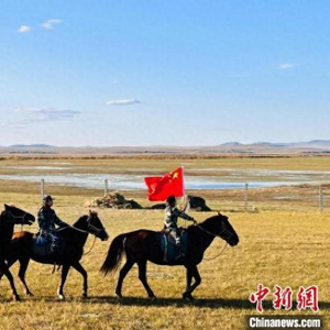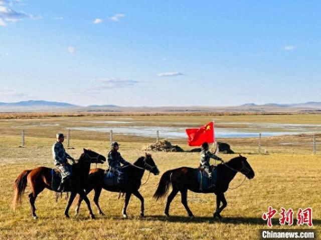 资料图。图为2023年国庆节期间,础鲁带着两个女儿骑马巡边,朵儿举着五星红旗走在巡边队伍的最前面。 新巴尔虎左旗宣传部供图
