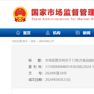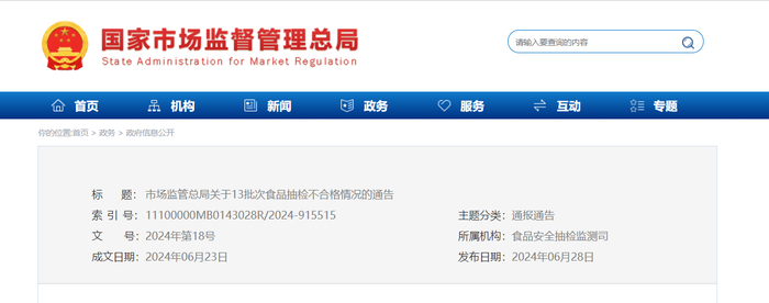 市场监管总局关于13批次食品抽检不合格情况的通告〔2024年 第18号〕