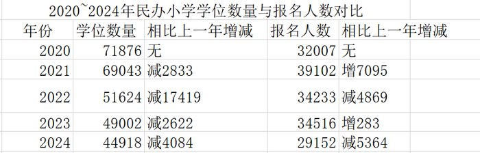 从数据可见,5年来民办小学的学位供应量持续减少,2021年民办小学招生总计划比2020年减少2833个;2022年招生学校减少了27所,学位暴减1.3万个;2023年民小学位再减2622个,低至4.9万个;2024年招生学校减少13个,学位再减4021个。民办小学的收缩趋势一目了然。