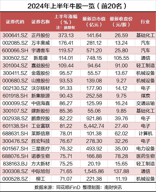 股价翻倍的“大牛股”有5只,“牛股之王”由正丹股份(300641.SZ)当选,今年上半年股价涨幅超过373%。据悉,该公司是一家特种精细化工领域的高科技企业,主要从事环保新材料和特种精细化学品的研发、生产和销售。受主要产品销量及售价均增加的影响,2024年一季度,正丹股份业绩大幅增长,一季度的营业收入达到了5.18亿元,同比增长28.8%;净利润达到了5899.25万元,同比增长高达412.94%。6月11日晚间,正丹股份发布公告称,公司拟投资3.5亿元建设年产6.5万吨偏苯三酸酐绿色化升级改造项目。