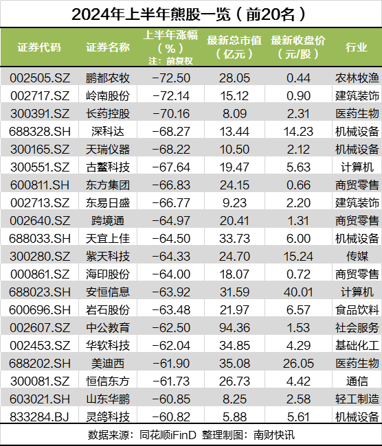 上半年跌幅第一的“熊股”为鹏都农牧(002505.SZ),累计下跌72.5%。资料显示,该公司是一家以农业产业化为经营核心的公司。鹏都农牧今日晚间公告称,截至2024年6月28日,公司股票连续18个交易日低于人民币1元,公司股票存在可能因股价低于面值被终止上市的风险。鹏都农牧2024年一季报显示,公司主营收入35.6亿元,同比下降28.23%;归母净利润大亏1.16亿元,同比下降194.66%。