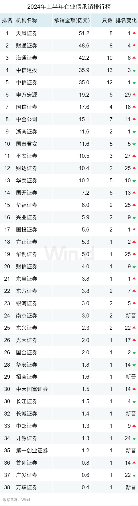 企业债方面天风证券位列第一,2024年上半年承销51.2亿元,财通证券、海通证券位列二、三位,承销金额分别为48.6亿元和42.2亿元。