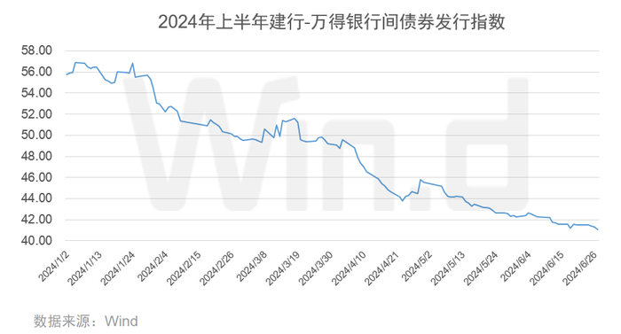 根据反映债券市场融资成本水平的“建行-万得银行间债券发行指数”显示, 2024年上半年总体发行成本呈下降趋势。该指数新年伊始短暂震荡后即一路走低,当前已下探至40-42的低位区间。