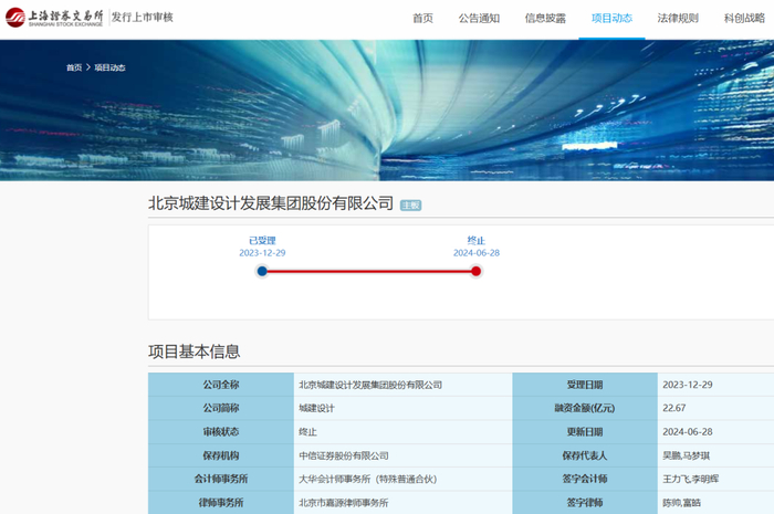 1、2024-06-28因北京城建设计发展集团股份有限公司及其保荐人撤回发行上市申请,根据《上海证券交易所股票发行上市审核规则》第六十三条有关规定,本所终止其发行上市审核。
