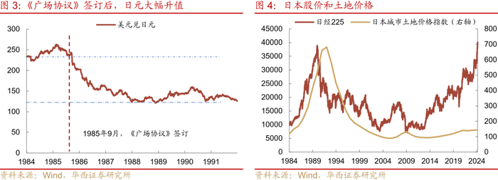 《广场协议》签订后,日元大幅升值。协议签订前美元兑日元汇率在240左右,截至1985年末升值幅度达19.9%,1986年日元升值26.5%。1987年2月,六国集团签订卢浮宫协议,美国不再强迫日元与马克升值,但当年日本汇率仍升值30.6%。到1988年末,日元汇率已达到1美元兑121日元的阶段性高点,日元汇率升值约1倍。在这种情况下,国外投资者仅通过套汇博取日元升值收益就可以获得可观收入,因此吸引国外资金涌入日本货币市场。海外投资者在1985-1989年间持有的日元规模增加近34倍,达44万亿日元,同期还买入了124万亿日元的日股和日债等其他金融资产。
