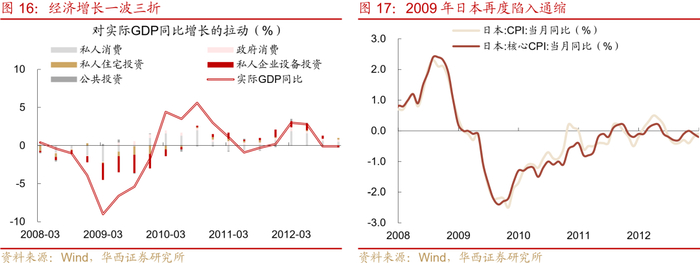 金融危机带来的直接冲击不大,但日本决策反应过慢,导致冲击被放大。2008年9月雷曼兄弟破产,全球金融危机爆发,日本的金融机构并没有在次贷危机中受到严重影响。正是在这种背景下,日本央行没有很快行动,为后续的冲击埋下伏笔。海外投资者在危机期间寻求避险资产,资金涌入日本市场,从而推动日元升值。叠加危机导发达经济体普遍陷入衰退,日本出口产业遭受严重打击,2009年一季度出口同比降幅一度达到69%;设备投资也陷入低迷,降幅达到22%。受此拖累,日本实际GDP增速大幅放缓,2008年降至-1.3%,2009年进一步降至-5.7%,且在2009年再次陷入通缩。伴随经济放缓,人与机器均面临“失业”,劳动市场失业率迅速上升1个百分点至5.5%的历史高点,设备产能利用率也一度大幅下降25%。
