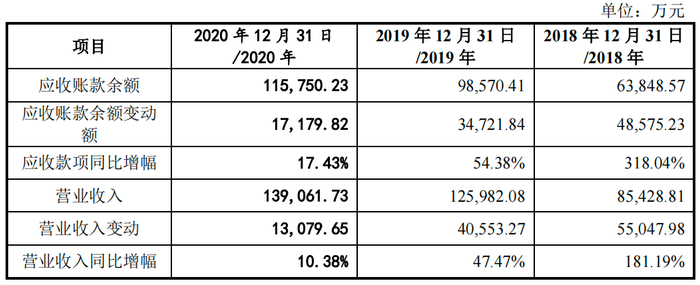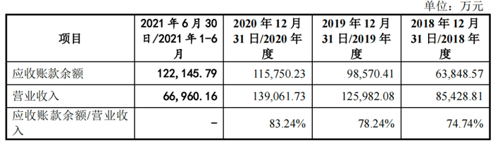 2018年-2021年上半年,旷视科技应收账款余额分别为6.38亿元、9.86亿元、11.58亿元及12.21亿元,2018年-2020年,公司应收账款余额占各期营业收入的比例分别为74.74%、78.24%、83.24%。
