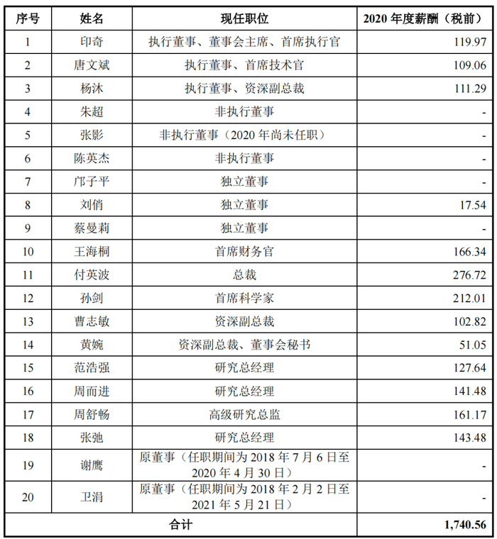 这些高管们拿着比公司创始人还要高的年薪,2020年,印奇、唐文斌、杨沐的年薪分别为119.97万元、109.06万元、111.29万元,而付英波、孙剑年薪分别为276.72万元、212.01万元,是创始人的两倍之多。