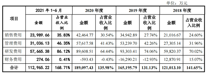 2018年-2021年上半年,公司期间费用分别为12.1亿元、16.52亿元、18.91亿元及11.3亿元,占各期营业收入的比例分别为141.65%、131.13%、135.98%及168.71%。