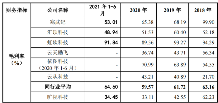 主营业务毛利率一降再降之下,旷视科技整体毛利率水平已经远远低于行业平均值,2021年上半年,同行业可比公司毛利率均值为64.6%,几乎是旷视科技的两倍。