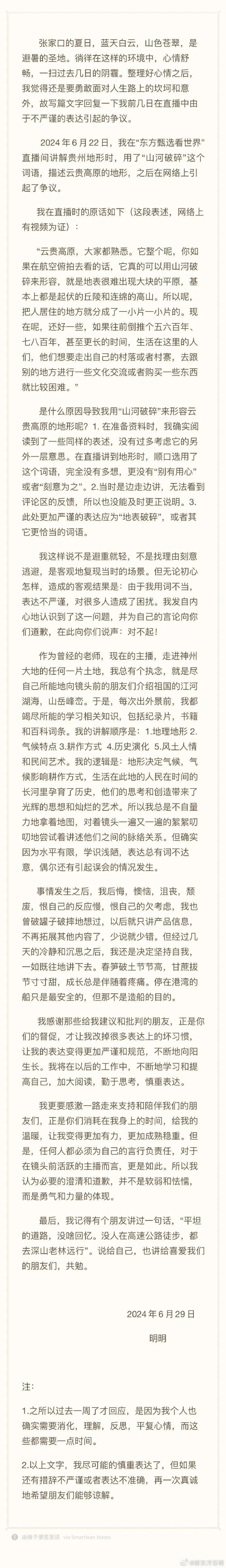 他表示,在准备资料时确实阅读到了一些同样的表述,没有过多考虑它的另外一层意思,在直播讲到地形时,顺口选用了这个词语,完全没有多想,更没有“别有用心”或者“刻意为之”;当时是边走边讲,无法看到评论区的反馈,所以也没能及时更正说明,此处更加严谨的表达应为“地表破碎”,或者其它更恰当的词语。他称,由于用词不当表达不严谨对很多人造成的困扰,其向公众致歉。