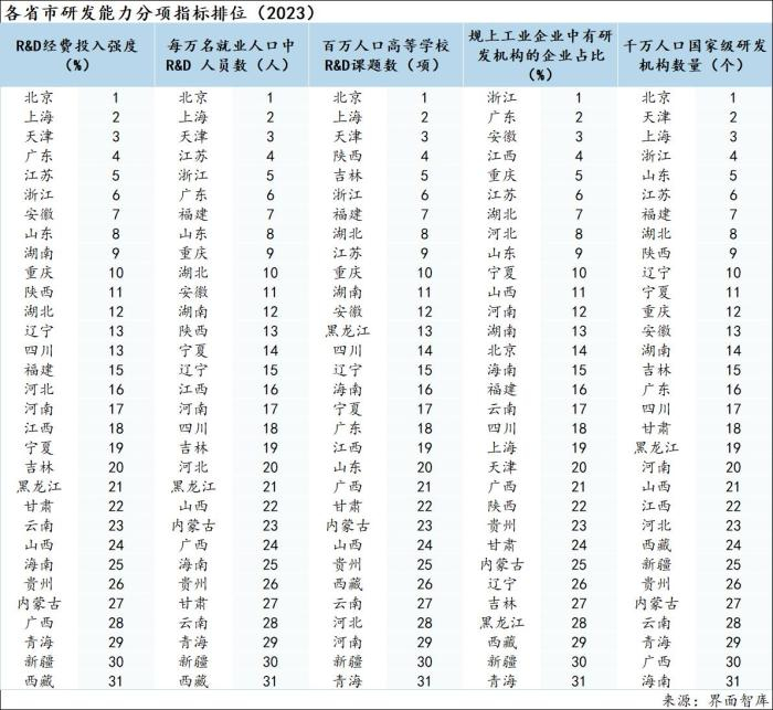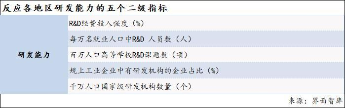 研发能力是新质生产力和新动能发展的基础,因此,界面智库在对区域科技创新能力进行评估时将其列为四个一级指标之一。该指标主要反映当地在研发方面的投入强度及研发水平,具体由5个二级指标构成,分别反映当地在科技创新投入的总规模和发展水平、投入研究开发活动的人力规模、高等学校的研发能力、企业层面的研发能力、当地拥有的国家级研发资源等。