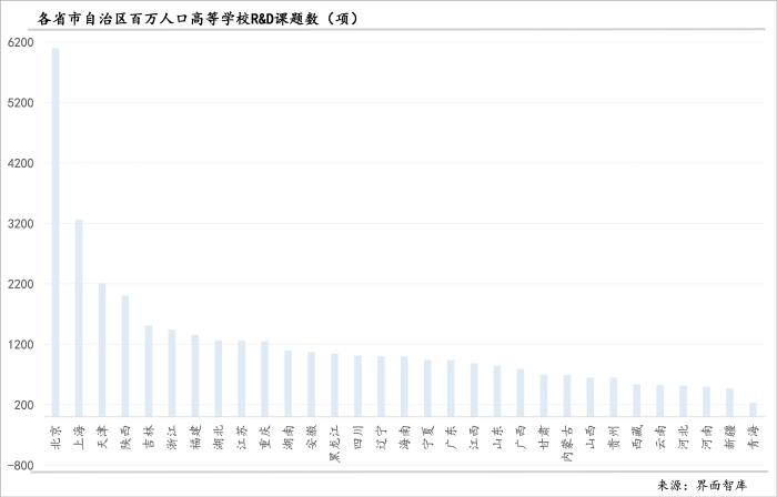 从百万人口高等学校R&D课题数来看,除北京遥遥领先外,排在第二位的上海也与其他省份拉开了距离,是第三位天津的1.5倍,进入前10的东部省份还有浙江、福建、江苏,分别排在第6、第7、第9位。前十中其余4个省份有西部地区2个(陕西和重庆)、中部地区1个(湖北)、东北地区1个(吉林)。广东和山东尽管高等学校R&D课题数不少、排位也较为靠前,但因为人口规模大,由此导致百万人口高等学校R&D课题数排位靠后。