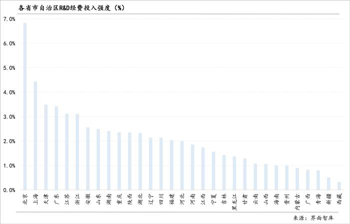 从R&D经费投入强度来看,北京、上海、天津、广东、江苏、浙江居前六位,除北京以6.83%显著高于其他省份外,上海也以4.44%的投入强度与其他地区拉开一定距离,天津、广东、江苏、浙江的R&D经费投入强度都超过3.1%但不足3.5%,山东则以2.5%居第8位。有六个省份R&D经费投入强度不足1%,从高到底依次为贵州、内蒙古、广西、青海、新疆、西藏,均为西部省份。