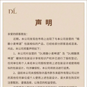 1、本公司对自营的“DL精酿小麦啤酒”及“DL精酿黑啤酒”罐体的包装设计享有知识产权并已进行了版权登记,任何单位和个人未经本公司授权使用上述包装设计或使用相似的包装设计,均涉嫌侵权,本公司将依法进行追责。