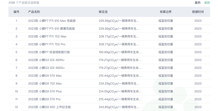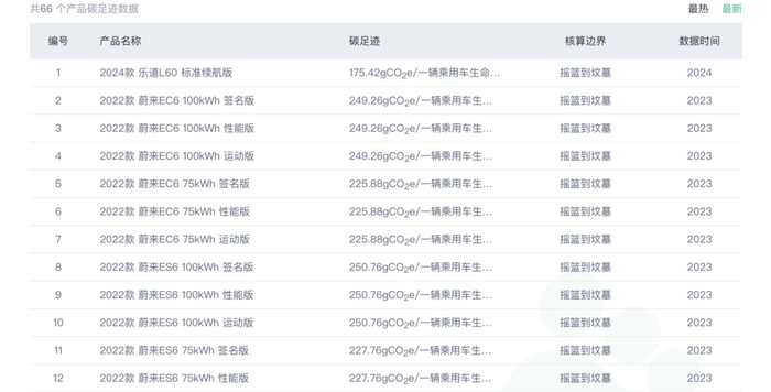 从中国汽车产业链碳公示平台的产品全生命周期碳足迹数据看,蔚来的整体表现并不优于小鹏。(截图自IPE官网,数据来源于中国汽车产业链碳公示平台)