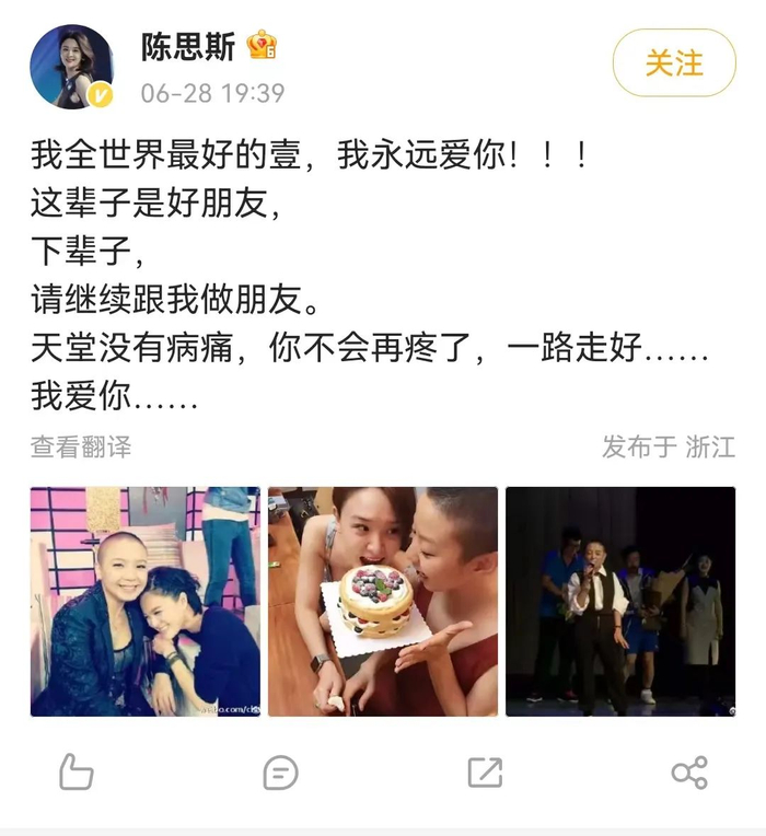 28日,演员陈思斯透露,《中国好声音》学员、歌手王韵壹去世,年仅38岁,“天堂没有病痛,你不会再疼了,一路走好……我爱你……”