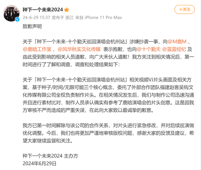 关于「种下一个未来-十个勤天巡回演唱会杭州站」涉嫌抄袭一事,向@M鹿M 、@鹿晗工作室 、@风华秋实文化传媒 表示抱歉,也向@十个勤天@蓝蓝经纪 及由此受到影响的相关人员道歉,向广大禾伙人道歉!我方关注到相关情况后,第一时间进行了了解和调查,调查和处理结果如下: