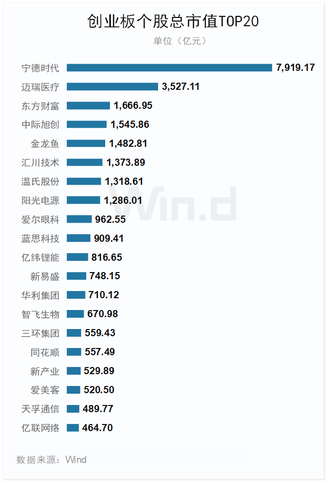 2024年上半年末,宁德时代以总市值7919.17亿元位居首位,迈瑞医疗、东方财富等7家公司总市值均超千亿元。