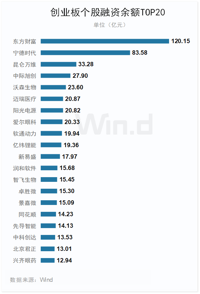 2024年上半年末,东方财富融资余额达120.15亿元居首位,宁德时代、昆仑万维等7家融资余额均超过20亿元。