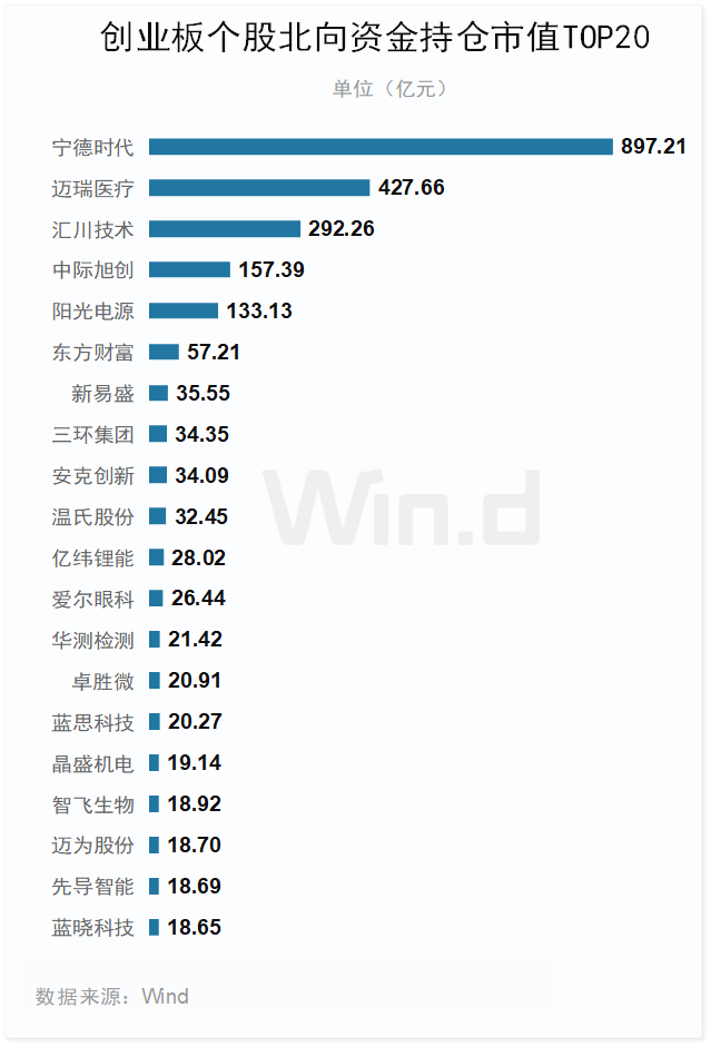 2024年上半年末,北向资金持仓708家创业板公司,其中宁德时代持仓规模最大,达897.21亿元。迈瑞医疗、汇川技术、中际旭创和阳光电源紧随其后,4只个股持仓市值均超过百亿元。