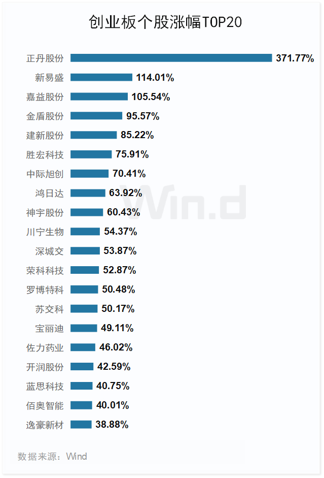 2024年上半年创业板个股有140只上涨(剔除新股上市首日涨幅),占比10.4%。正丹股份以大涨371.77%居首位,新易盛、嘉益股份和金盾股份等13家涨幅超过50%。
