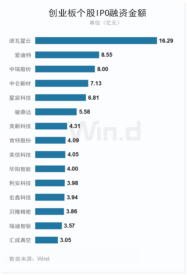 2024年上半年,诺瓦星云IPO募资16.29亿元位居首位,爱迪特、中瑞股份、中仑新材、星宸科技和骏鼎达5家融资规模均在5亿元以上。