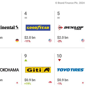 英国品牌评估机构“品牌金融”(Brand Finance)发布“2024全球轮胎品牌价值15强”(Tyres 25 2024)榜单,法国米其林、日本普利司通、德国大陆马牌蝉联前三位。