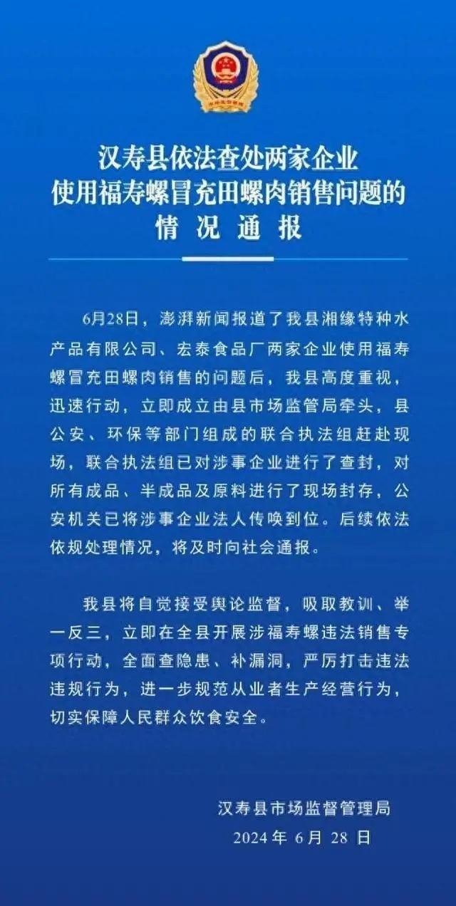 情况通报显示,6月28日,澎湃新闻报道了汉寿县湘缘特种水产品有限公司、宏泰食品厂两家企业使用福寿螺冒充田螺肉销售的问题后,汉寿县高度重视,迅速行动,立即成立由县市场监管局牵头,县公安、环保等部门组成的联合执法组赶赴现场,联合执法组已对涉事企业进行了查封,对所有成品、半成品及原料进行了现场封存,公安机关已将涉事企业法人传唤到位。后续依法依规处理情况,将及时向社会通报。