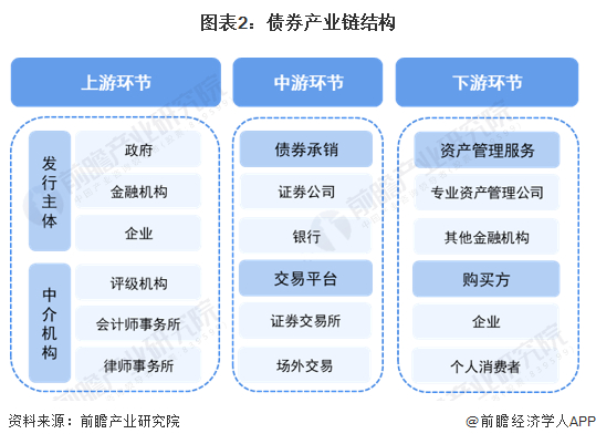 债券产业链的上游环节包括债券发行主体和提供各类服务的中介机构,其中发行主体包括政府、金融机构和企业,中介机构包括债券评级机构、会计师事务所、律师事务所。中游环节包括债券承销和债券交易,其中债券承销商是取得证券承销业务资格的证券公司和银行,债券交易可在场内(证券交易所)或是场外进行。下游是债券的流通环节,购买方分为企业和个人消费者,随着行业的发展近年来还有资产管理机构的介入,为购买者提供债券组合的管理服务。
