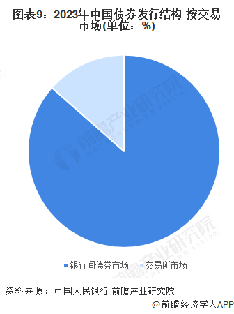 2023年,在中国债券市场中,银行间债券市场发行债券61.4万亿元,占比达到86%,接近九成;交易所市场发行债券9.6亿元,占比为14%。