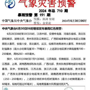 预计,6月30日08时至7月1日08时,江苏南部、安徽南部、江西北部、浙江西部、上海、湖南西南部和东北部、广西北部、贵州东南部等地部分地区有暴雨,其中,安徽南部、江西北部、浙江西北部、湖南西南部、贵州东南部、广西东北部等地部分地区有大暴雨,湖南西南部等地局地特大暴雨(250~260毫米)。上述部分地区伴有短时强降水(最大小时降雨量20~60毫米,局地可超过80毫米),局地有雷暴大风等强对流天气。