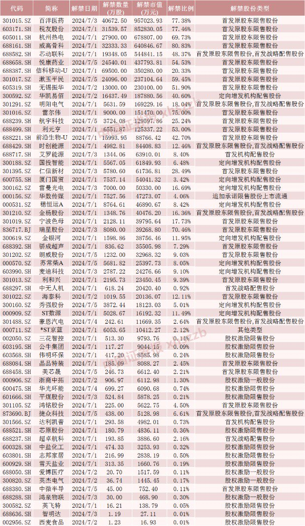 具体来看,百洋医药7月3日将解禁4.07亿股,税友股份7月1日将解禁3.15亿股,杭州热电7月1日将解禁2.79亿股,均为首发原股东限售股份。