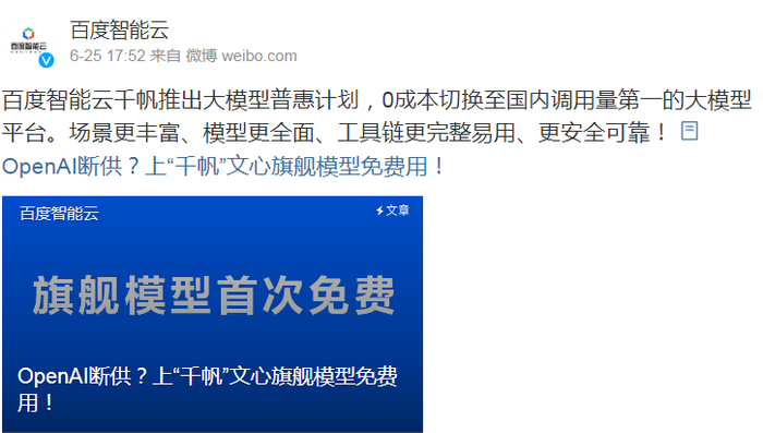 随后,包括百度、商汤、智谱AI在内的多家大模型公司宣布提供“零成本”迁移服务。