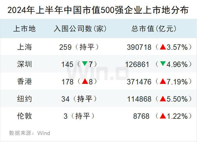 2024年上半年,上海入围市值500强公司数持平,深圳则减少7家,香港入围公司数增加8家。除深圳外,各地入围公司总市值均出现不同程度增长。