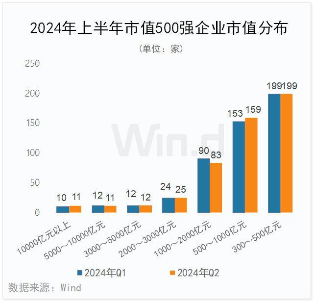 2024年上半年,市值500强企业各区间段市值公司数量变化较小。万亿市值以上企业有11家,较2024年一季度增长1家;500-1000亿元和1000-2000亿元区间段公司数量变化略大,分别为增加6家和减少7家。