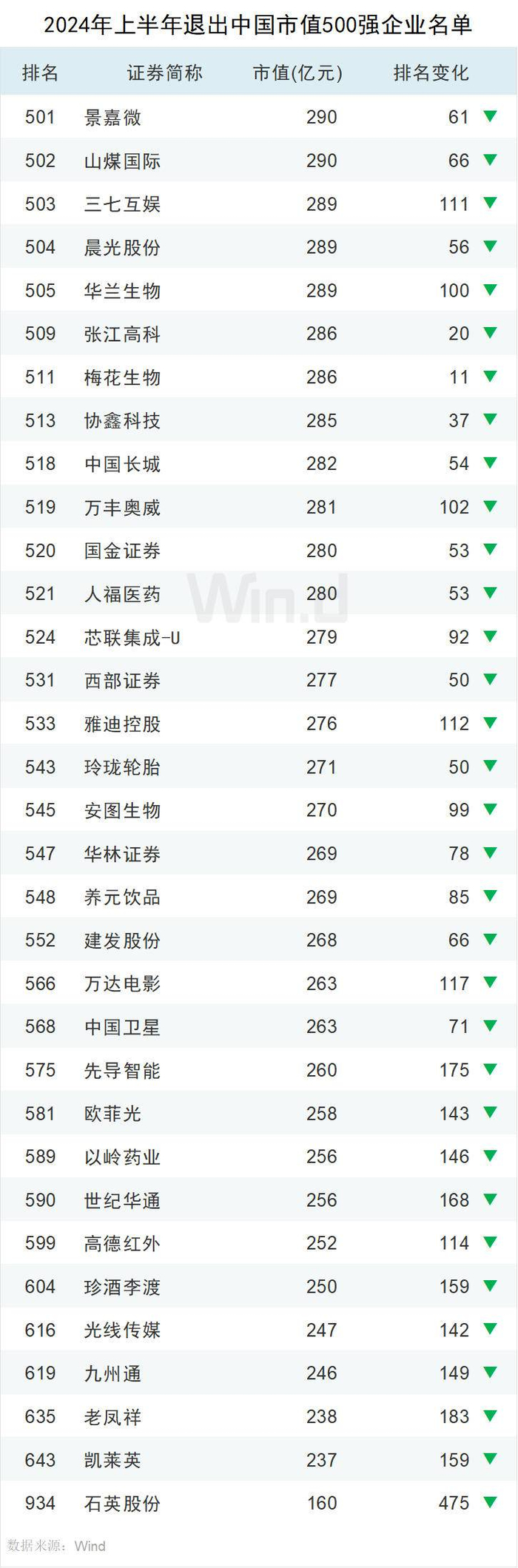 2024年一季度,共有33家企业退出市值500强行列,行业风向转变和股价下跌导致部分公司市值快速缩水。
