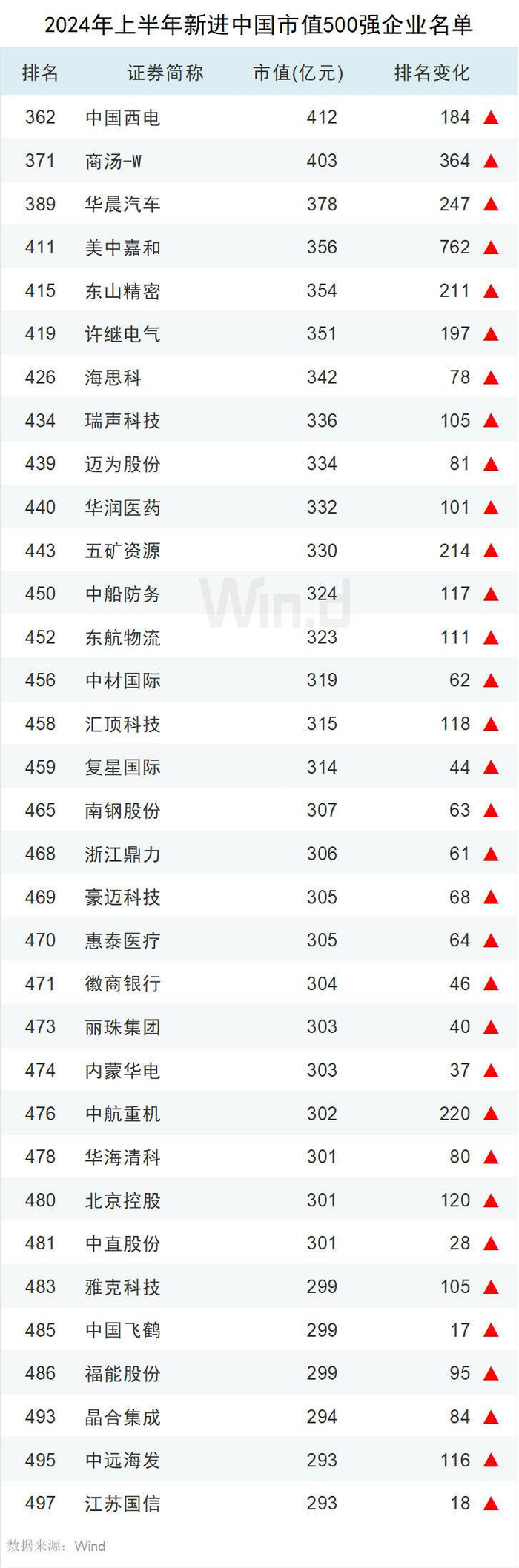 2024年上半年,共有33家新面孔跻身市值500强,其中商汤-W、华晨汽车、美中嘉和、五矿资源、中航重机等公司市值排名增长均超过200位。