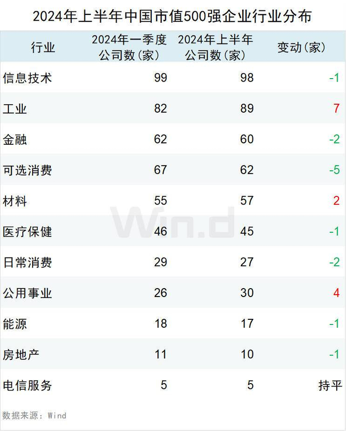 从市值500强企业行业市值变动来看,2024年上半年有6个行业市值增加,5个行业市值减少。其中,公用事业行业总市值增长17.48%,达30359亿元;电信服务、能源板块市值相比2024年一季度分别增长11.92%和7.59%;日常消费、医疗保健、房地产板块市值相比2024年一季度分别减少13.07%、7.28%和2.27%。