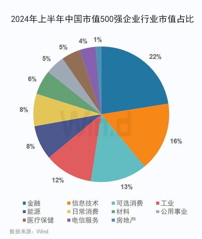 2024年上半年,市值500强企业行业市值占比前三名分别为金融、信息技术和可选消费,金融业市值占比最高,达22%。