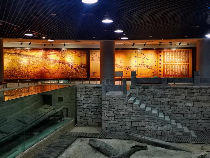 隋唐大运河博物馆远远看去,宛如一艘乘风破浪的航船,70%以上馆藏文物来自柳孜运河遗址。1998年,在淮北市濉溪县一条“宿州—永城”的公路施工中,当公路修至柳孜集村时,人们发现拆迁的屋基下有摆放整齐的一排排方正条石,经过文物部门联合考古队进驻柳孜集,才揭开了柳孜大运河遗址的神秘面纱。这里,河道、桥墩的遗迹清晰可见,除了发现石构建筑物遗迹和大量瓷器等文物,还出土了8艘唐代沉船,这在考古史上是前所未有的,填补了运河考古多项空白。