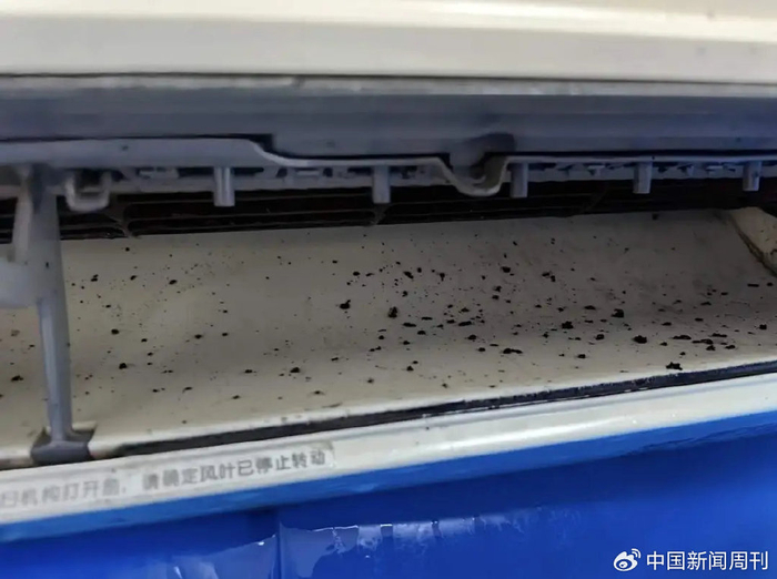 图源:小红书@嘘(已获授权)空调的出风口和接水槽也极容易聚集污物。不少空调的出风口布满霉斑,有的接水槽内的水也浑浊不堪,四周也是霉迹斑斑。